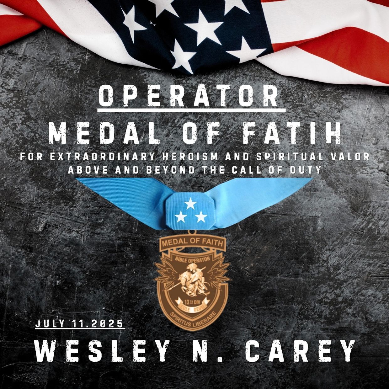 ROCKWALL, TEXAS — Bible Operator, Inc., a national military and veteran men’s ministry, proudly announces the awarding of the Operator’s Medal of Faith to Commander Wesley N. Carey, a 13-year Army Special Forces combat veteran, for extraordinary heroism and spiritual valor above and beyond the call of duty during a life-and-death crisis on July 11, 2025.