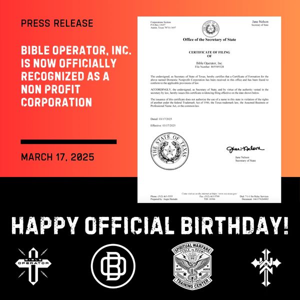 ROYSE CITY, TEXAS – Bible Operator, Inc. is proud to announce that as of March 17, 2025, we are officially recognized as a nonprofit corporation under the laws of the State of Texas. This milestone is the result of two years of unwavering dedication, dating back to March 7, 2023, when Bible Operator first launched its website and initiatives to serve Christian military service members and veterans through faith-based training, mentorship, and community-building.